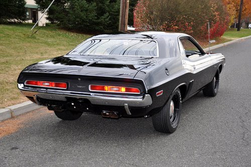 This 1971 Hemi Challenger RT is one of 58 4-speed cars and one of less than 12 produced with a factory shaker hood. It has a 3:54 Dana, Track-Pack rear-end and is finished in TX9 Black Velvet with a black interior and factory white R/T stripe. It is equipped with original "450" Steelie wheels and date coded Polyglass GT tires. It is a three owner car with a nut and bolt rotisserie restoration recently completed on a 5800 original mile car. It has the original matching numbers engine and the correct Hemi 4-speed transmission. It is fully documented with owner history, fender tags, two original build sheets, factory warranty card and authenticated by Mopar guru Galen Govier.